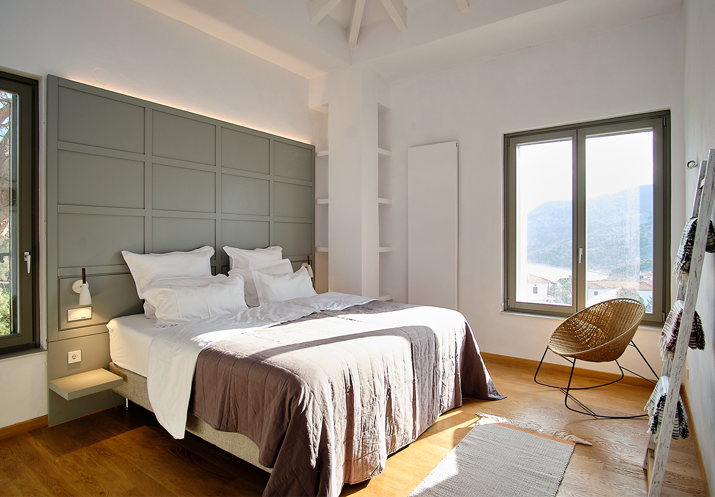 Die Häuser sind im traditionellen Pilion-Stil mit einer Kombination aus regionalen Natursteinfassaden und -Dächern, weißen Putzflächen und grau-grünen Holzfensterläden gebaut. Innen sind die zweigeschossigen Häuser offen und modern gestaltet und hochwertig ausgestattet. Kleine Wege und Natursteintreppen verbinden die Häuser und Pools untereinander und binden die Anlage an das Dorf an.