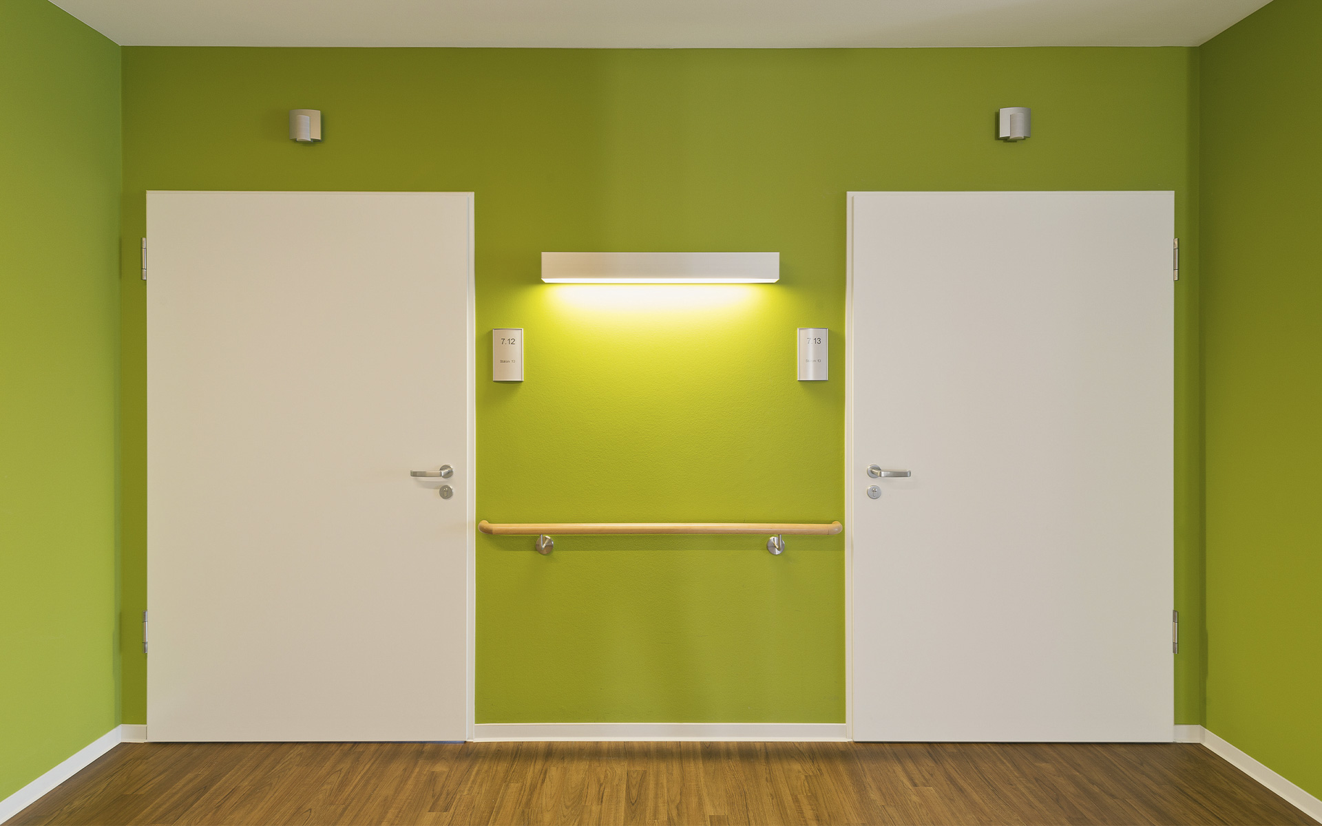 Das 2012 beauftragte, zweigeschossige Gebäude bietet 30 stationäre Therapieplätze für betagte und hoch betagte Patienten. Im Erdgeschoss befinden sich dabei die publikumsintensiven und entsprechend hoch frequentierten Zonen, wie z. B. Aufenthalts- und Speiseraum, Therapieräume und Ärztezimmer, während im Obergeschoss Einzelzimmer und Doppelzimmer für die Patienten angesiedelt sind. Die Putzfassade des Neubaus greift in Materialität und Farbigkeit Merkmale der Bestandsgebäude auf. Das mit dem Bettentrakt 2010 neu eingeführte Motiv der horizontalen Fensterbänder mit deutlicher Rahmung der einzelnen Fenster kommt auch in der geriatrischen Rehabilitationseinrichtung zum Einsatz und wird dabei zum prägenden Gestaltungselement. Vor dem Hintergrund eines engen Budgetrahmens wurde durch die entschiedene und durchgehende Farbgestaltung und eine feine Differenzierung der Putzoberflächen eine zeitgemäße Architektursprache mit hohem Identifikationsgrad entwickelt und damit eine deutliche Aufwertung der funktionalen und wirtschaftlichen Anlage erreicht. Zudem wurde der Ensemblecharakter des Rehabilitationszentrums Oldenburg gestärkt.