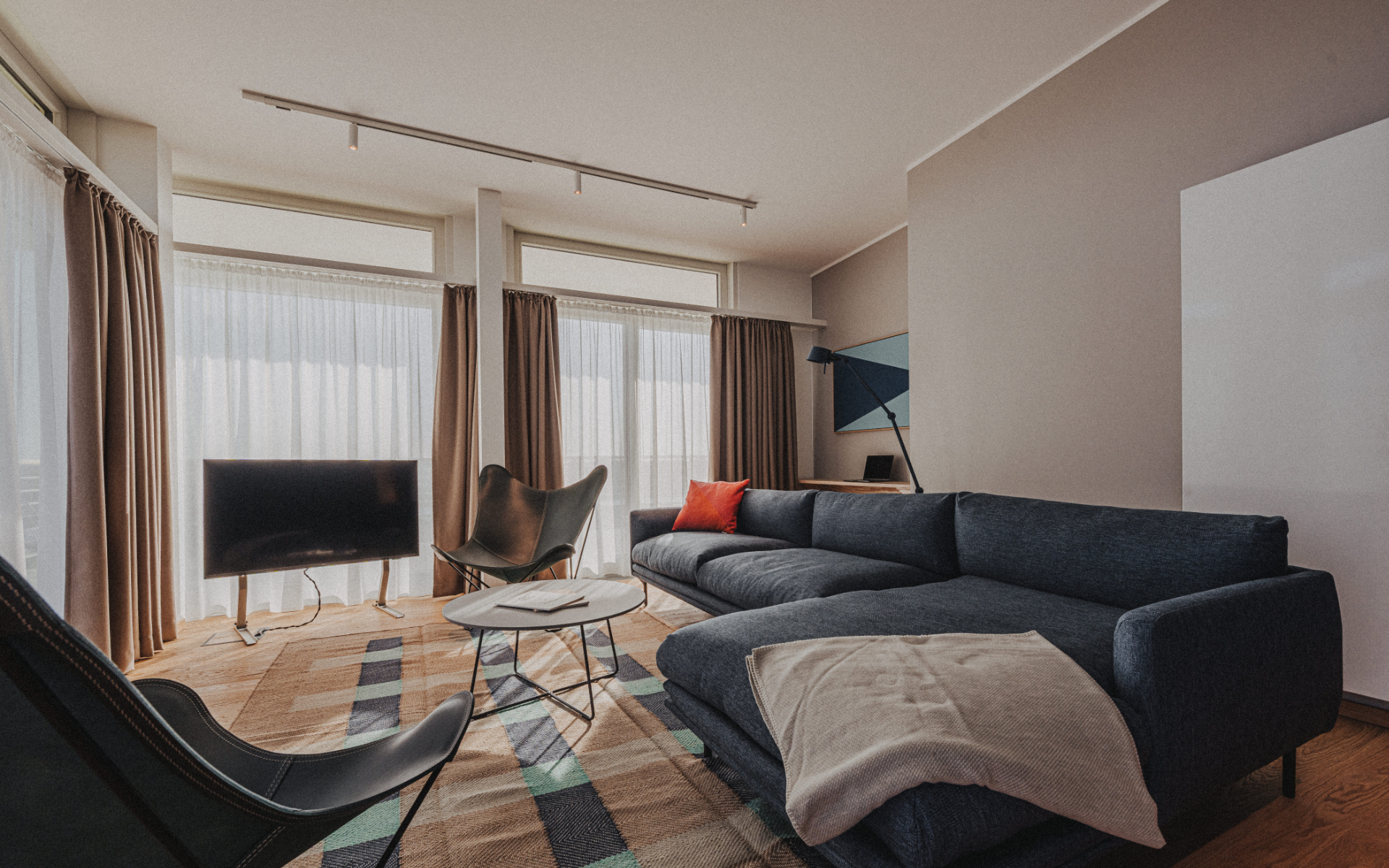 Unser Interior Design Konzept greift das maritime Erbe der Insel auf und interpretiert es neu: Warme Naturmaterialien wie Eiche und Seekiefer, kombiniert mit klaren Linien, leuchtendem Orange und tiefem Blau, schaffen eine Atmosphäre, die Ruhe ausstrahlt und zugleich Akzente setzt. Farbige Kunstwerke, inspiriert von maritimen Flaggen und Seefahrtszeichen, verleihen jedem Raum eine grafische und emotionale Tiefe – eigens für das Hotel entwickelt und handgefertigt.